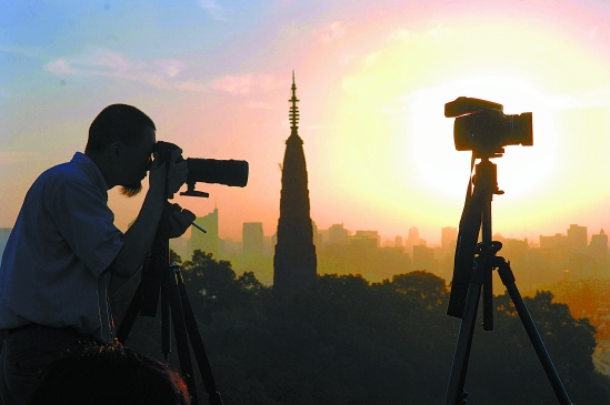 8月7日早晨,大批摄影爱好者和游客在宝石山上观赏流霞。宝石流霞是杭州西湖新十景之一,夏秋的早晚是观赏流霞最好的时段。 本报记者 吴国方 摄