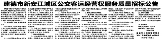 《建德市新安江城区公交客运经营权服务质量招标投标总体方案》已经建德市第十四届人民政府2010年第19次市长办公会议讨论通过。建德市新安江城区公交客运经营权服务质量招标投标工作将于2010年8月进行,现将有关事项公告如下:
