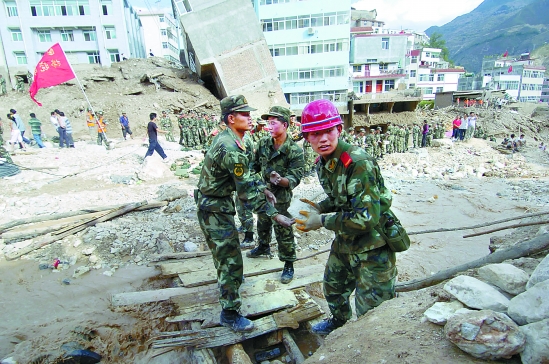 8月8日,解放军、武警官兵与受灾群众一起抢险救灾。 新华社记者 高健钧 摄