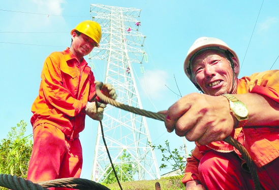 为保障大电网供电,绍兴市电力建设者采用早晨和傍晚清凉时段,错时开工的方法,确保人员安全。图为8月9日上午,施工人员在利用早晨时间抢进度的现场。 张亮宗 摄