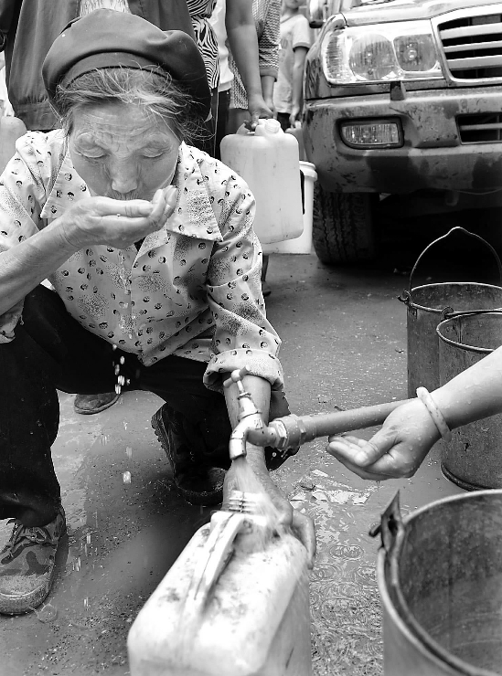 8月13日,76岁的丁水仙看到清澈的自来水,美美地喝了一口。经多方努力,目前舟曲城区居民和救灾人员的日常用水可基本满足。 新华社记者 陶明 摄