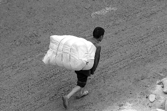 8月12日,一名运送救灾物资的志愿者走过舟曲街头。 新华社记者 邢广利 摄