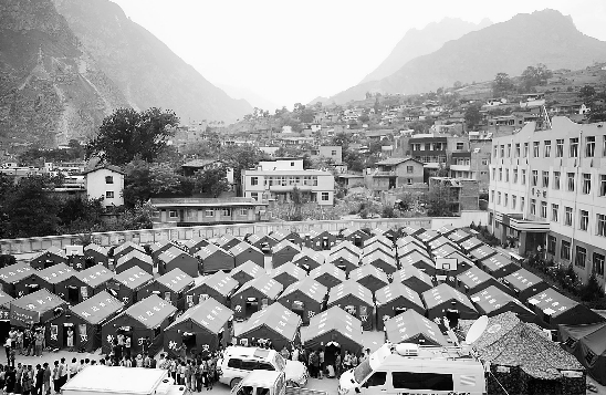 8月11日,舟曲三中操场上搭建的救灾帐篷。 新华社记者 聂建江 摄