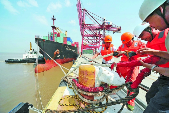 8月15日9时30分,一艘利比里亚籍集装箱班轮在舟山金塘港区大浦口集装箱码头解缆离港,驶往厦门港。这是宁波-舟山港金塘港区大浦口集装箱码头试投产后迎来的第一艘较大型外国籍集装箱船。姚峰 王宗文 摄