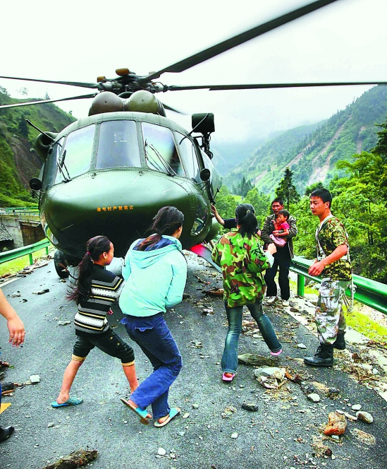 8月14日,受困群众准备搭乘救援直升机离开龙池。8月13日下午至晚上,四川都江堰市龙池、虹口两地因强降雨导致山洪暴发,近800人被困。灾害发生后,成都军区空军派出救援直升机转移受困群众和伤员。新华社发(刘应华 摄)