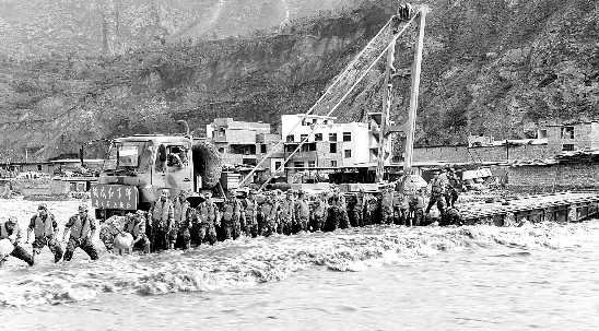 8月14日,兰州军区某部工兵团在舟曲县白龙江上架起轻型机械化桥,使机械车辆能够通过白龙江到对岸,进行河道清淤等工作。新华社记者 张永进 摄