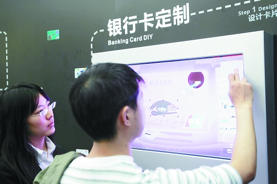 在交行世博三支行,游客通过触摸屏正在制作自己喜欢的银行卡。 东方IC供图
