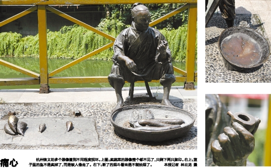 杭州信义坊多个雕像遭到不同程度损坏。上图:卖蔬菜的雕像整个都不见了,只剩下两只脚印。右上:篮子里的鱼不是卖掉了,而是被人偷走了。右下:断了的烟斗看来是不能抽烟了。本报记者 林云龙 摄