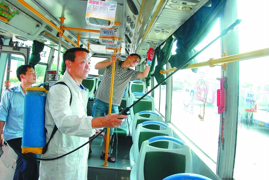 8月16日,金华市公交总公司一分公司的工作人员,对301路公交线上的空调车内扶手、护栏、座椅、车窗玻璃等乘客接触频繁的部位和空调的出风口进行消毒。