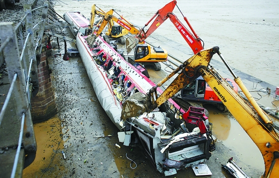 | 8月20日,大型机械对受损列车车厢进行解体准备运离。 当日,石亭江洪水退去,宝成铁路抢险人员将旅客行李和生活用品从K165次列车坠入河中的车厢中抢运出来,随后对受损的车厢进行切割和解体。目前,宝成铁路广汉境内石亭江大桥的抢险工作已经接近尾声,之后将转入线路恢复阶段。 新华社记者 江宏景 摄 |