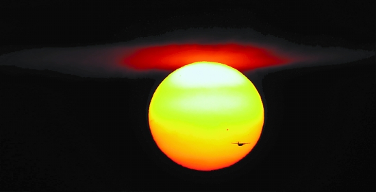 2010年8月5日,一架飞机从夕阳前飞过。 新华社发