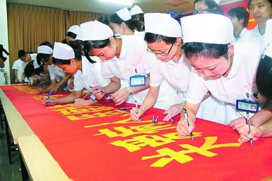 | “我要自觉维护医院员工廉政形象,执行廉政纪律,遵守廉政规定,加强道德修养,廉洁从医……”近日,杭州市第三医院举行新同志岗前廉政行医宣誓活动,该院今年新进医院的49位“准医生”、“准护士”,身穿白大褂,宣誓遵守“廉政纪律”、“爱岗敬业”、“廉洁从医”等行为准则,并在“关爱病人、医德为先、干净干事”横幅上郑重签下自己的名字。黄春燕 摄 |