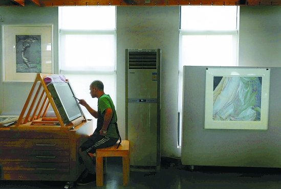 一名艺术家在深圳观澜版画村的版画工坊里创作。 新华社发
