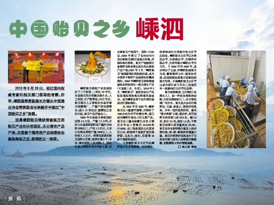 2010年8月26日,经过国内权威专家和相关部门领导的考察、评审,嵊泗县常务副县长方敏从中国渔业协会常务副会长林毅手中接过“中国贻贝之乡”金匾。
