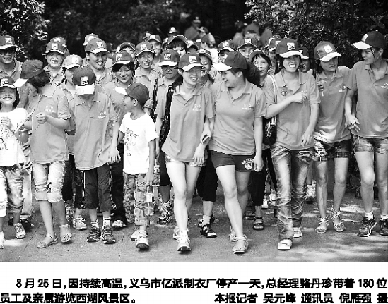 8月25日,因持续高温,义乌市亿派制衣厂停产一天,总经理骆丹珍带着180位员工及亲属游览西湖风景区。本报记者 吴元峰 通讯员 倪雁强 摄