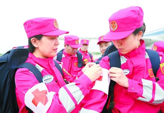 8月26日,中国国际救援队的医疗队员在抵达巴基斯坦拉瓦尔品第的恰克拉拉军用机场后整理红十字袖标。 新华社记者 袁满 摄