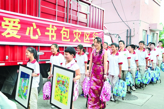 8月25日,宁波北仑区新碶街道大港社区举行1000个爱心书包启运仪式。这些书包是当地企业和市民捐献给舟曲灾区小朋友的。 龚国荣 顾霄扬 摄