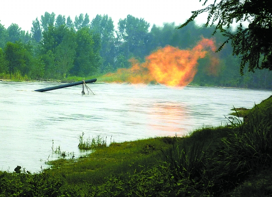 8月27日,河道内的煤气管道被冲断后引发大火。新华社发(陈建磊 摄)