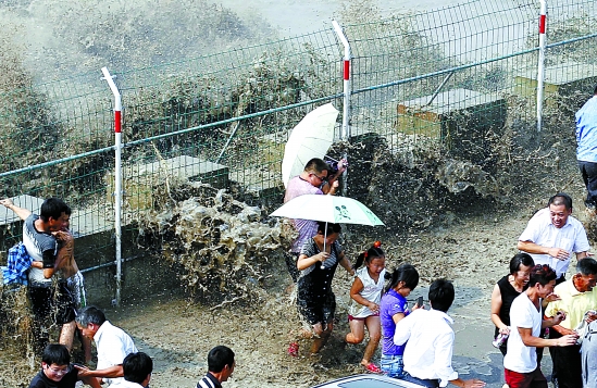 昨天是农历七月十八,钱塘江迎来今年第一大潮。在杭州萧山区美女坝观潮点,汹涌的潮水冲上堤岸,吓得游客们四散奔逃。观潮必须在指定区域,注意人身安全。 本报记者 董旭明 摄
