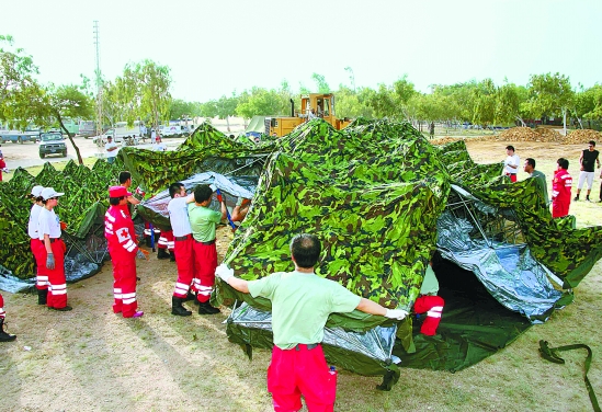 8月28日,在巴基斯坦南部城市特达市郊,中国国际救援队队员搭建流动帐篷医院。 新华社记者 袁满 摄