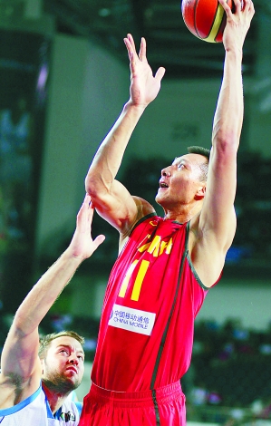 | 8月28日,中国队球员易建联(右)在比赛中勾手投篮。 新华社记者 才扬 摄 |