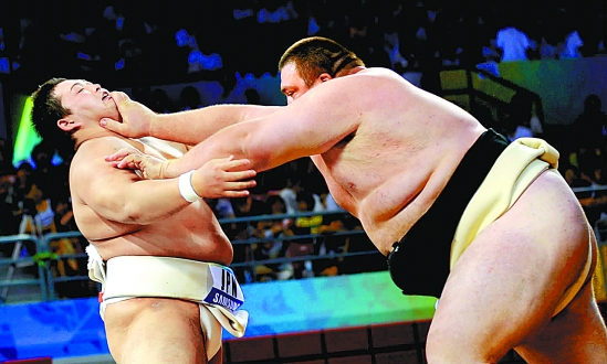 8月28日,在2010年北京首届世界武搏运动会相扑男子重量级决赛中,俄罗斯选手卡拉耶夫·艾伦(右)战胜田中宏明夺得冠军。 新华社记者 王毓国 摄