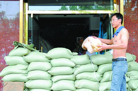 8月28日,丹东居民在转移前加固沿江店面。 新华社记者 郭昱 摄