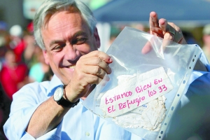 皮涅拉总统挥舞着从井下带上来的便条,兴奋地对媒体和被困矿工亲友宣布这一消息。