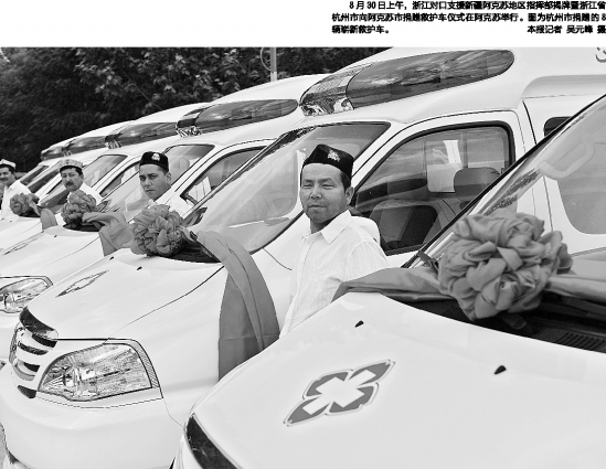 8月30日上午,浙江对口支援新疆阿克苏地区指挥部揭牌暨浙江省杭州市向阿克苏市捐赠救护车仪式在阿克苏举行。图为杭州市捐赠的8辆崭新救护车。本报记者 吴元峰 摄