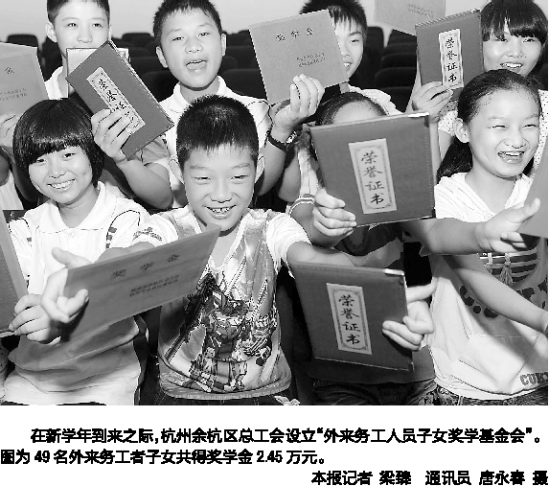 在新学年到来之际,杭州余杭区总工会设立“外来务工人员子女奖学基金会”。 图为49名外来务工者子女共得奖学金2.45万元。
