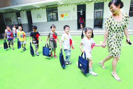 昨天,杭州和睦小学新生领到了学校为他们精心准备的小书袋。放进必备的学习用品和水杯后,小书袋重量仅1斤。黄佳健 黄葆青 摄