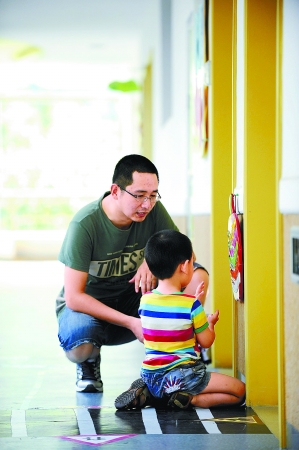 | 一位家长在陪孩子做游戏,让孩子尽快放松,适应新的环境。 |