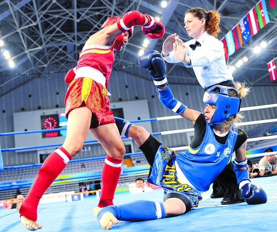 9月2日,西班牙选手费尔南德斯(左)与土耳其选手萨恩(下)在决赛中。当日,在首届武搏会泰拳女子51公斤级决赛中,费尔南德斯战胜萨恩获得冠军。 新华社记者 郭勇 摄