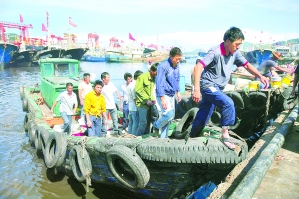 | 昨天,在温岭礁山港,渔民上岸避风。郏策 摄 |