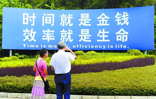 一位长者在为年轻人解释“时间就是金钱,效率就是生命”这句口号的由来。