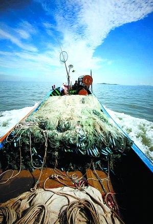 陆老大的渔船并不大,也就十来米长、两三米宽的样子,甲板上堆满网具后几乎就没有什么立足的空间了,一个小小的浪头都能让船猛烈地颠簸。除了老大,船上其他4人都是雇佣的伙计,这些渔民近年来都选择了转产,只有鱼汛期才偶尔下海捕上几水。