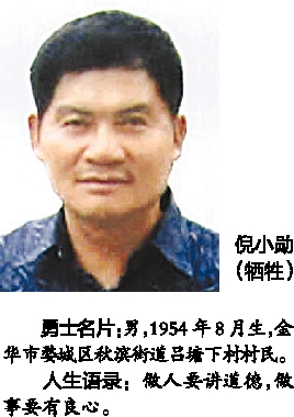 勇士名片:男,1954年8月生,金华市婺城区秋滨街道吕塘下村村民。