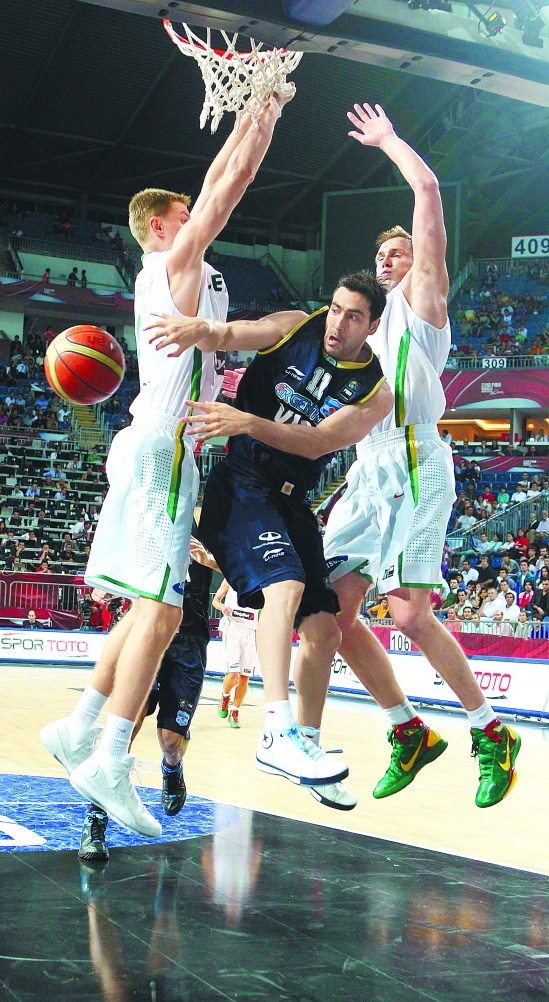 9月9日,阿根廷队球员金特罗斯(中)在比赛中传球。当日,在土耳其伊斯坦布尔举行的2010年男篮世锦赛四分之一决赛中,立陶宛队以104比85战胜阿根廷队。美国队以89比79战胜俄罗斯队。 新华社记者 才扬 摄