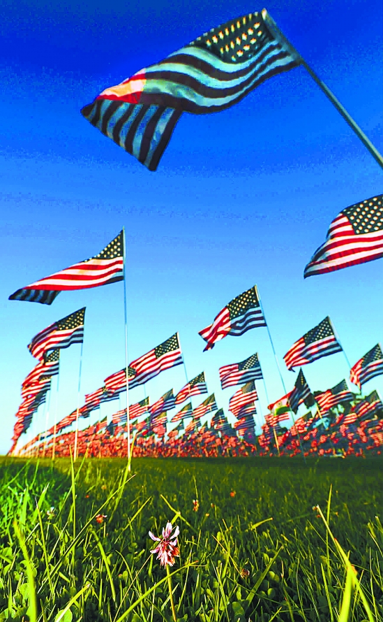 9月10日,美国加利福尼亚州马里布一些大学生,在佩珀代恩大学的草坪上插上近3000面美国国旗和其他国家和地区的旗帜,纪念“9·11”恐怖袭击事件的遇难者。 新华社记者 戚恒 摄