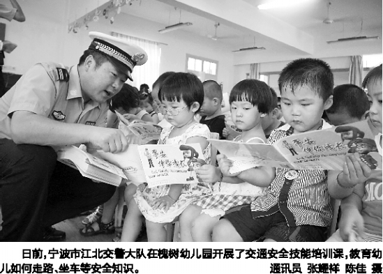日前,宁波市江北交警大队在槐树幼儿园开展了交通安全技能培训课,教育幼儿如何走路、坐车等安全知识。 通讯员 张耀祥 陈佳 摄