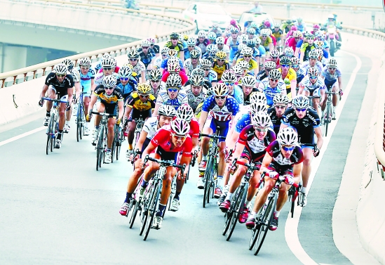9月14日,车手们在比赛中经过一座立交桥。当日,2010环中国国际公路自行车赛进行了第四赛段洛阳至郑州的比赛,选手们的骑行距离达到173.3公里。
