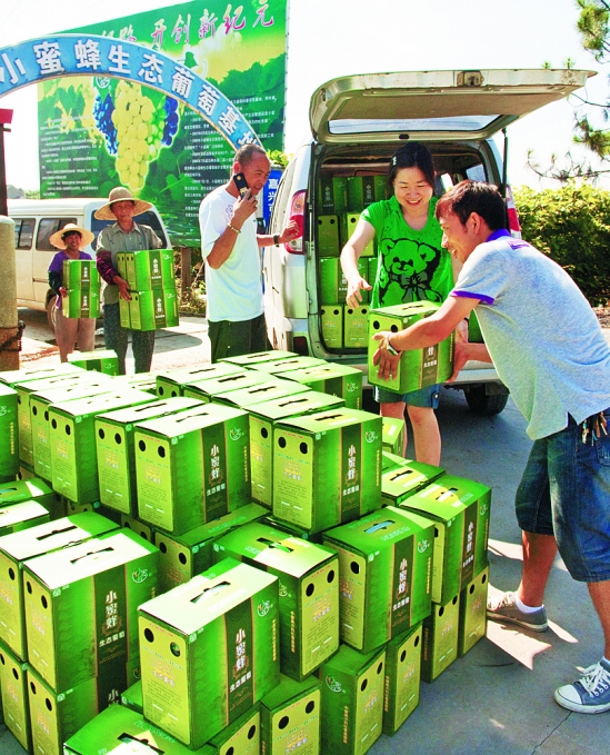 嘉善县罗星街道的“小蜜蜂”生态葡萄凭借优良的品质,先后打入杭州、上海等地的超市。图为首批500箱“小蜜蜂”生态葡萄正装箱上车,空运北京,以每公斤40元的价格供应北京市民。县报道组 王建超 摄