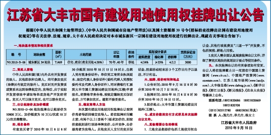 根据《中华人民共和国土地管理法》、《中华人民共和国城市房地产管理法》以及国土资源部39号令《招标拍卖挂牌出让国有建设用地使用权规定》等有关法律、法规、规章,大丰市人民政府决定对本市城东新区一宗国有建设用地使用权进行挂牌出让,现就有关事项公告如下: