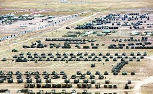| 马特布拉克训练场布满战车。右上为歼-10双机编队(资料照片)。 新华社记者 王建民 摄 |
