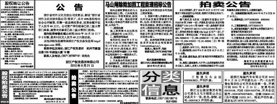 受委托,本公司定于2010年9月29日14时30分在杭州市文晖路97号杭州人才大厦六楼会议室举行拍卖会,现将有关事宜公告如下: