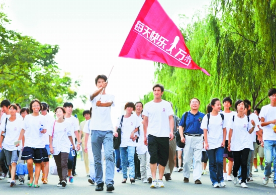 卫生部、中国记协举办,可口可乐中国公司支持的“中国健康知识传播激励计划(吃动平衡·2010)”暨步行日校园行活动日前在浙江工商大学举行,300余名大学生在我省运动员朱书靖带领下,进行了校园步行。本报记者 陈熙春 摄