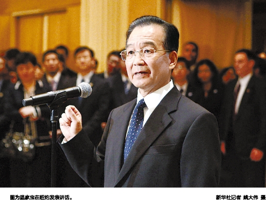 图为温家宝在纽约发表讲话。 新华社记者 姚大伟 摄