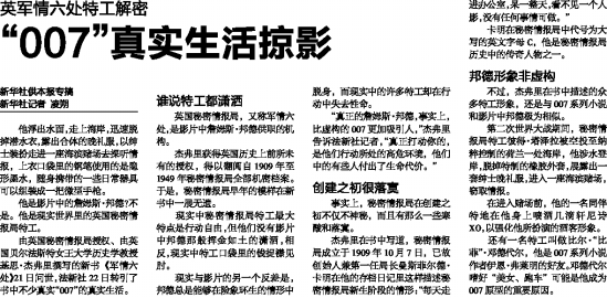 由英国秘密情报局授权、由英国贝尔法斯特女王大学历史学教授基思·杰弗里撰写的新书《军情六处》21日问世,法新社22日转引了书中不少真实“007”的真实生活。