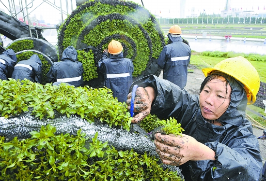 9月23日上午,天下着雨,一些园林工人放弃假日休息,在杭州下沙新城赶制大型园艺造型《奔腾》,为即将到来的国庆佳节营造气氛。
