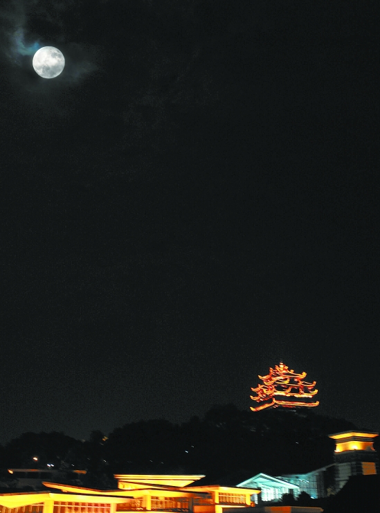 农历八月十六晚9时许,一轮圆月高悬天空。本报记者 黄曙林 摄于杭州吴山